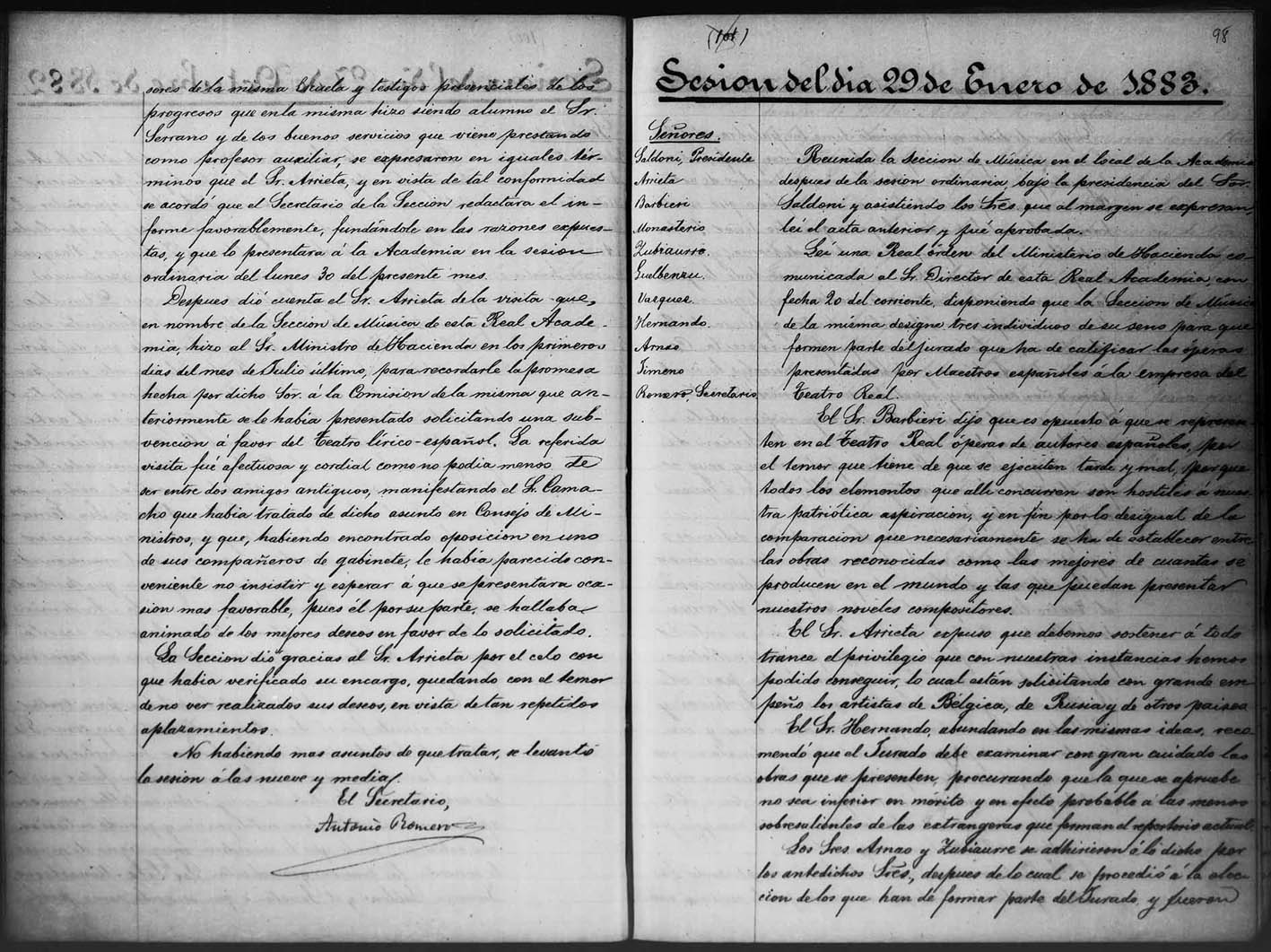 Real Academia de Bellas Artes de San Fernando. Sección de Música. Libro de actas.