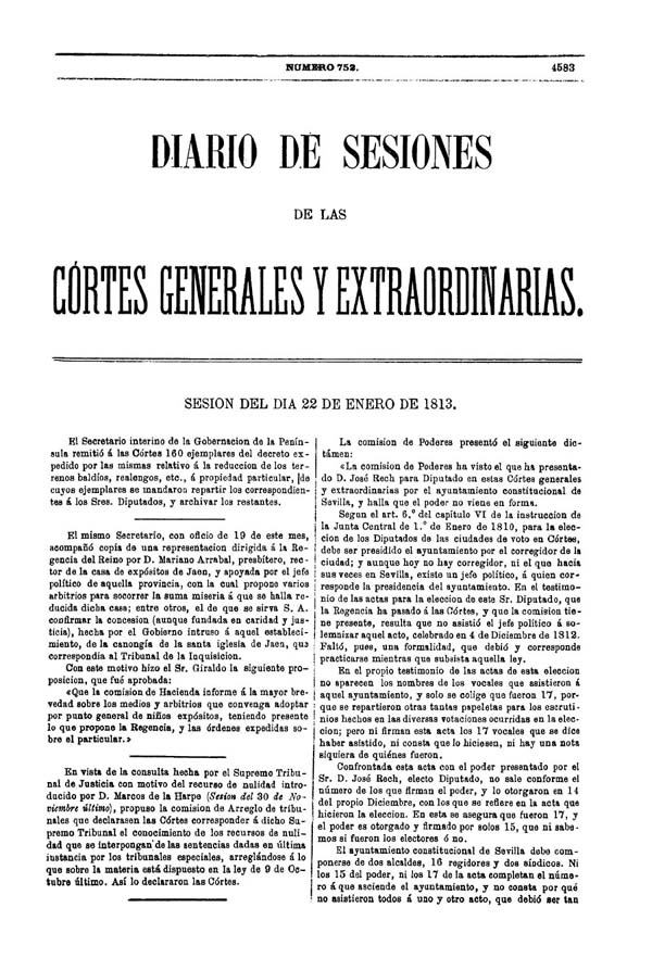 Diario de sesiones de las Cortes Generales y Extraordinarias- 1813Núm. 735 (01-01-1813) al núm. 978 (20-09-1813) |