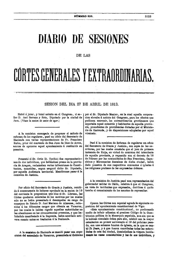 Diario de sesiones de las Cortes Generales y Extraordinarias- 1813Núm. 735 (01-01-1813) al núm. 978 (20-09-1813) |