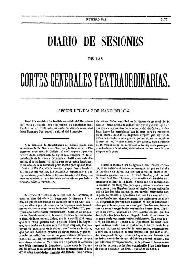 Diario de sesiones de las Cortes Generales y Extraordinarias- 1813Núm. 735 (01-01-1813) al núm. 978 (20-09-1813) |